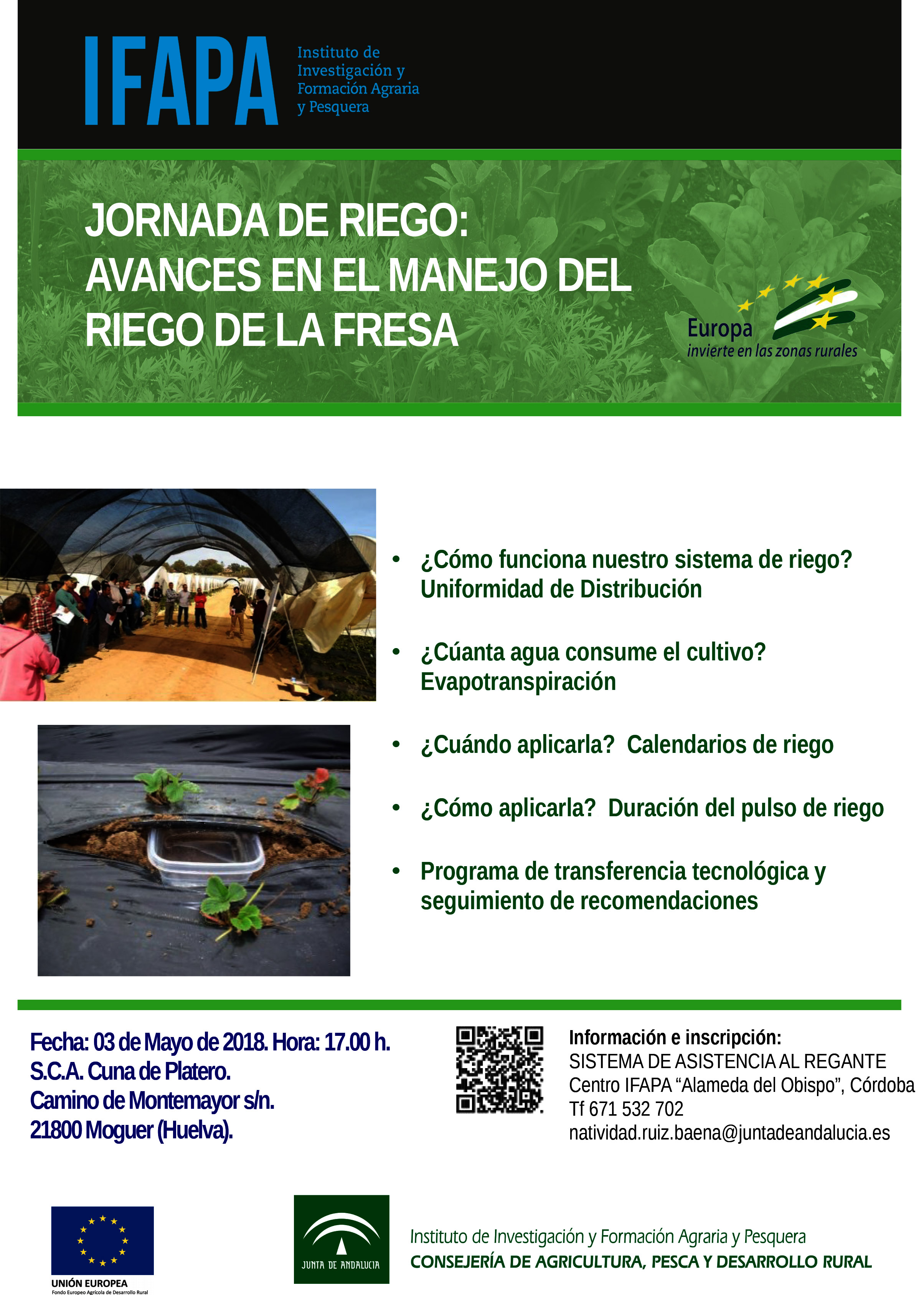 Cuna de Platero acoge una jornada del Instituto de Investigación y Formación Agraria y Pesquera (Ifapa) sobre el riego sostenible en el cultivo de fresa. Tendrá lugar el próximo jueves, día 3 de mayo, a partir de las 17.00 horas.
