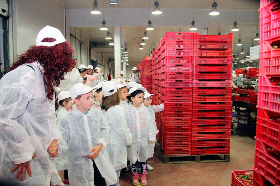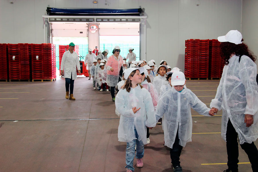 Tras el campo, los niños han visitado la cooperativa, donde han hecho el mismo recorrido que realizan las fresas en sus instalaciones cuando llegan para ser manipuladas y preparadas para salir hacia los supermercados: muelle de recepción, expedición, manipulación, pesado, envasado, etc.
